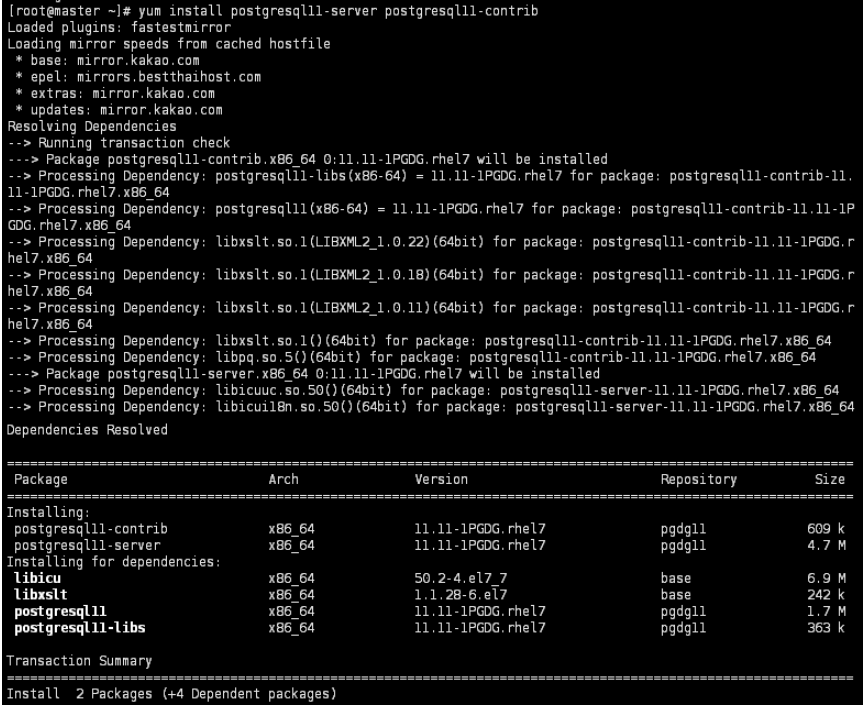 [root@master ~]# yum install postgresql11-server postgresql11-contrib