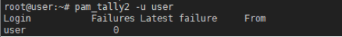 pam_tally2 -u user 명령어로 현재 로그인 시도 횟수를 확인했을 때 0회로 나오는 것을 볼수 있습니다.